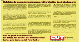 Sob o título “Golpistas do impeachment querem retirar direitos dos trabalhadores”, a CUT-RS, federações e sindicatos filiados publicaram nesta quinta-feira (10) um apedido na página 3 do jornal Correio do Povo. “Eles são os mesmos que vêm tentando aprovar medidas no Congresso Nacional, que atacam direitos trabalhistas e precarizam o trabalho”, aponta o texto.
