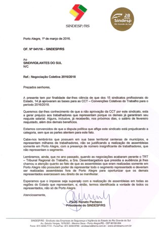 – Em todas as negociações e na correspondência que enviaram, os patrões alegam que os sindicatos filiados à Federação dos Vigilantes (Fepsp-RS) já assinaram a Convenção – com novas escalas, inclusive – como Alto Uruguai, Santa Cruz do Sul, Santa Maria e Passo Fundo. No rastro desses, outros sindicatos também aceitaram a proposta da patronal. A patronal afirma que não vai fazer uma CCT diferente com o Sindivigilantes do Sul.